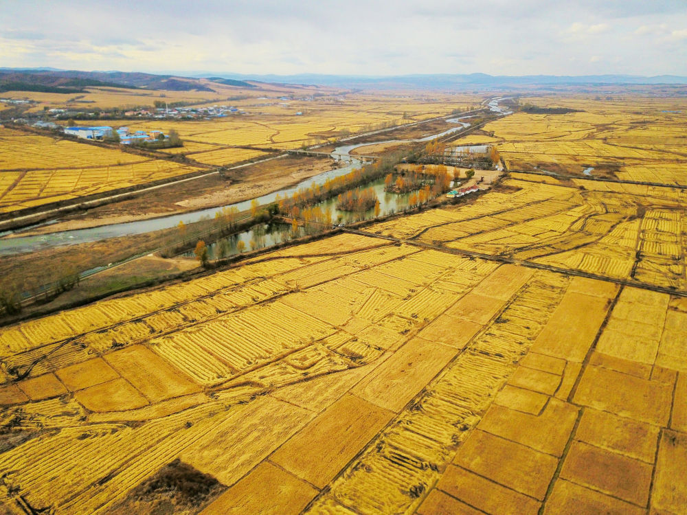 上圖:這是在吉林省延邊朝鮮族自治州和龍市光東村拍攝的秋收稻田(無(wú)人機(jī)照片)。黃昕欣攝