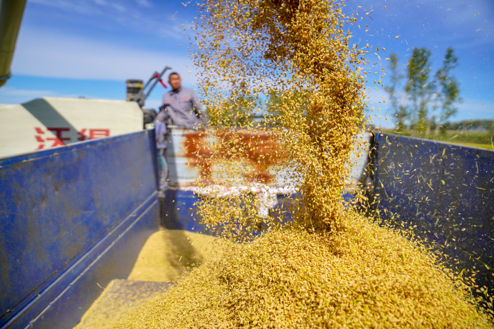 上圖:在吉林省長(zhǎng)春市九臺(tái)區(qū)龍嘉農(nóng)樂(lè)種植家庭農(nóng)場(chǎng),農(nóng)民操作農(nóng)機(jī)將收獲的水稻送入拖拉機(jī)。張楠攝