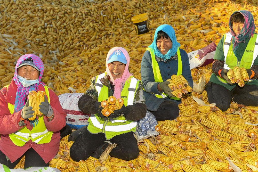上圖:在吉林省公主嶺市環(huán)嶺街道土城子村志和農(nóng)機(jī)服務(wù)專業(yè)合作社內(nèi),農(nóng)民分揀收獲的玉米。許暢攝