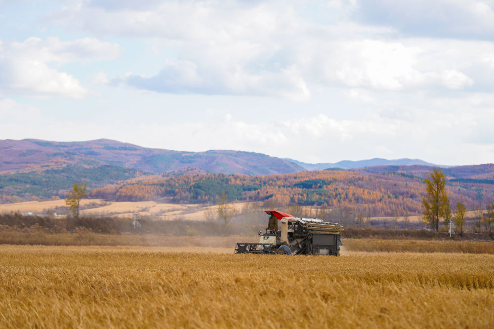 上圖:在吉林省延邊朝鮮族自治州和龍市光東村,農(nóng)民駕駛農(nóng)機(jī)收割水稻。顏麟蘊(yùn)攝