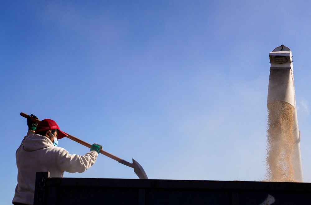 上圖:在吉林省公主嶺市樂(lè)農(nóng)糧食收儲(chǔ)有限責(zé)任公司,工作人員通過(guò)傳送帶將收獲的玉米轉(zhuǎn)運(yùn)至存儲(chǔ)倉(cāng)。許暢攝