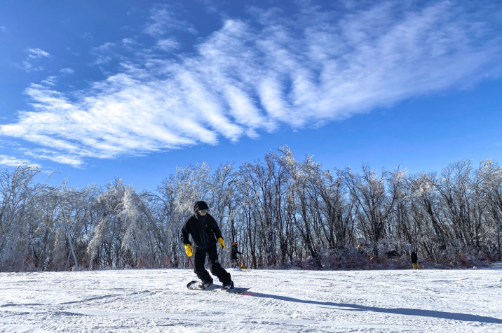 滑雪愛好者在位于吉林市的萬科松花湖度假區(qū)滑雪場(chǎng)體驗(yàn)滑雪樂趣。