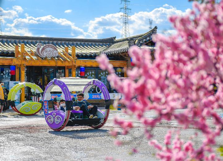 2020年5月6日,在吉林省延邊朝鮮族自治州和龍市西城鎮(zhèn)金達(dá)萊民俗村,村民在村內(nèi)的咖啡館前體驗親子游樂項目。新華社記者 許暢 攝