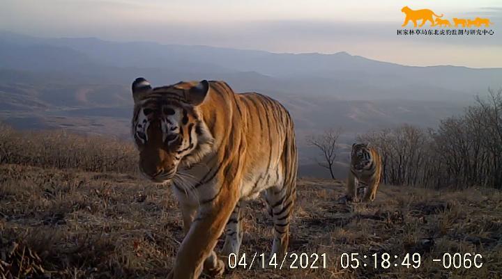 監(jiān)測畫面中,東北虎正在山中行走(2021年4月14日攝)。新華社發(fā)(東北虎豹國家公園管理局供圖)