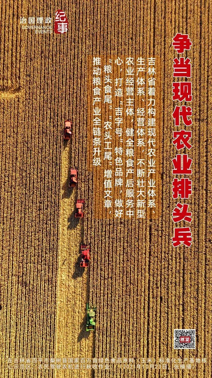 ◆ 吉林省著力構建現(xiàn)代農業(yè)產(chǎn)業(yè)體系、生產(chǎn)體系、經(jīng)營體系,不斷壯大新型農業(yè)經(jīng)營主體,健全糧食產(chǎn)后服務中心,打造“吉字號”特色品牌,做好“糧頭食尾”“農頭工尾”增值文章,推動糧食產(chǎn)業(yè)全鏈條升級。