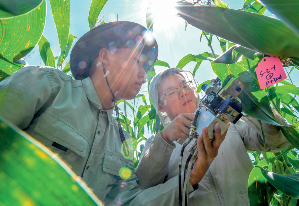 在吉林省梨樹縣,中國農業(yè)大學在讀博士生沙野(右)和崔帥在試驗田里測量玉米光合作用(2022年8月17日攝) 張楠攝 / 本刊