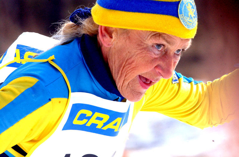 2003年3月15日,一位來自瑞典的老年人在“中國長春凈月潭瓦薩洛佩特國際滑雪節(jié)”越野滑雪比賽中奮力前行。新華社記者 徐家軍 攝