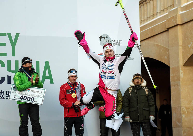 2015年1月1日,亞軍瑞典選手布萊恩特森(右二)在頒獎(jiǎng)儀式上跳躍慶祝。新華社記者 王昊飛 攝