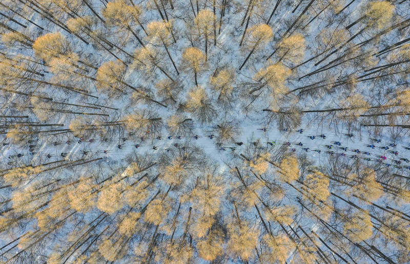 2020年1月4日,參賽選手在2020中國長春凈月潭瓦薩國際滑雪節(jié)暨2020國際雪聯(lián)越野滑雪中國巡回賽長春站比賽中(無人機(jī)照片)。新華社記者 許暢 攝