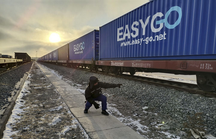 在吉林省長春市興隆鐵路口岸,工作人員劉帥檢查線路及車輛裝載加固情況(1月23日攝)。