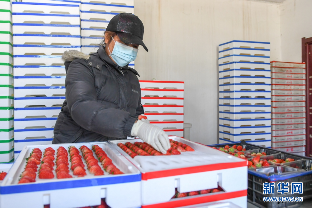 在梨樹縣梨樹鎮(zhèn)九九香農(nóng)業(yè)有限責任公司,農(nóng)民將剛采摘的草莓分等包裝。