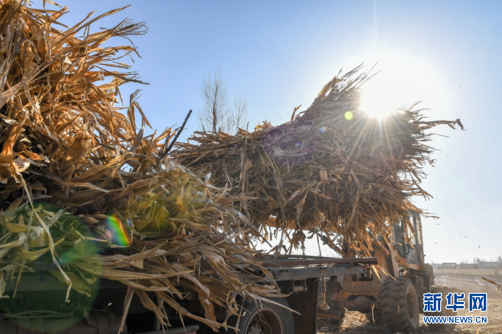 在吉林省長春市九臺區(qū)東湖街道腰站村,隆達興養(yǎng)殖農(nóng)民專業(yè)合作社農(nóng)民將玉米秸稈卸到場院。