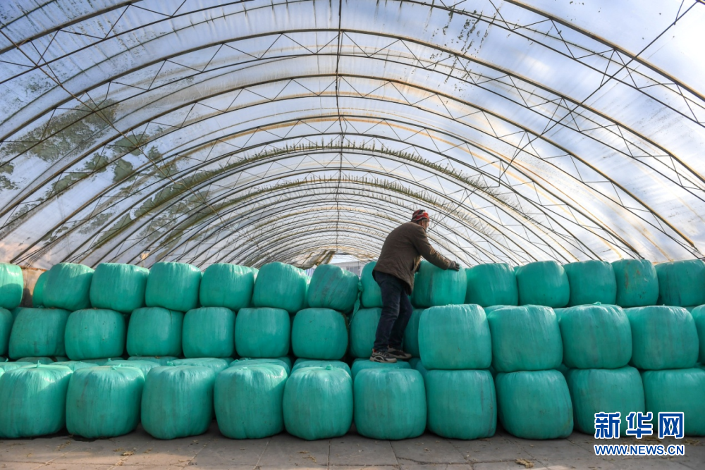 在吉林省長春市九臺區(qū)東湖街道腰站村,隆達興養(yǎng)殖農(nóng)民專業(yè)合作社農(nóng)民整理玉米秸稈壓縮包。