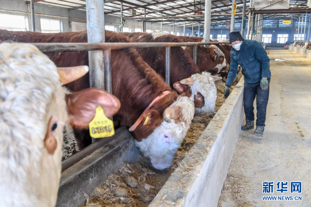 在吉林省長春市九臺區(qū)東湖街道腰站村,隆達興養(yǎng)殖農(nóng)民專業(yè)合作社農(nóng)民給肉牛投喂玉米秸稈飼料。