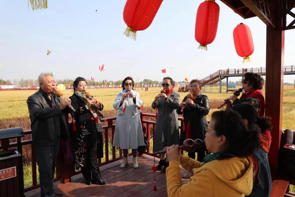 在松原市乾安縣大遐稻語花鄉(xiāng)公園,農(nóng)民文藝愛好者在吹葫蘆絲。